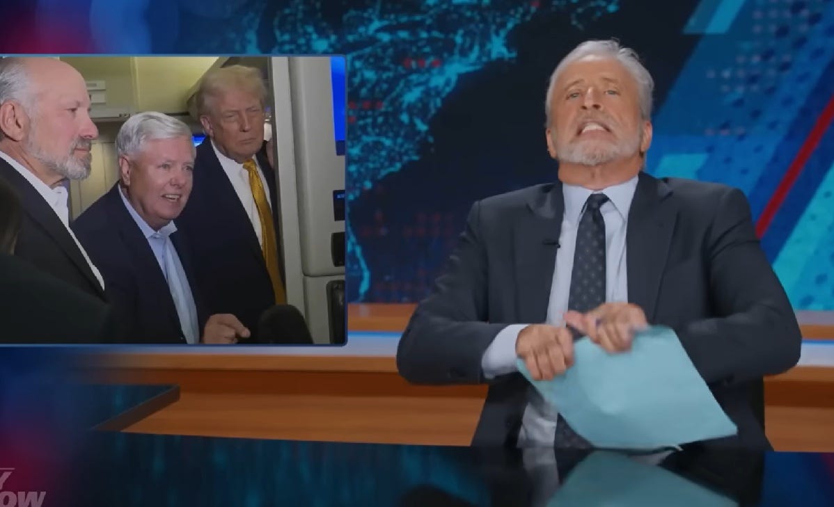 That answer finally pushed Stewart over the edge. Laughing in disbelief, he shouted: “Is this your first war? I mean what the fuck. All right, let’s table this for now. Senator Lindsey Graham, you’re an old hand in war mongering. You’ve done this a bunch. You’re on the plane. Can you help this dude out with a casus belli and keep Trump from bringing it back to oil?”